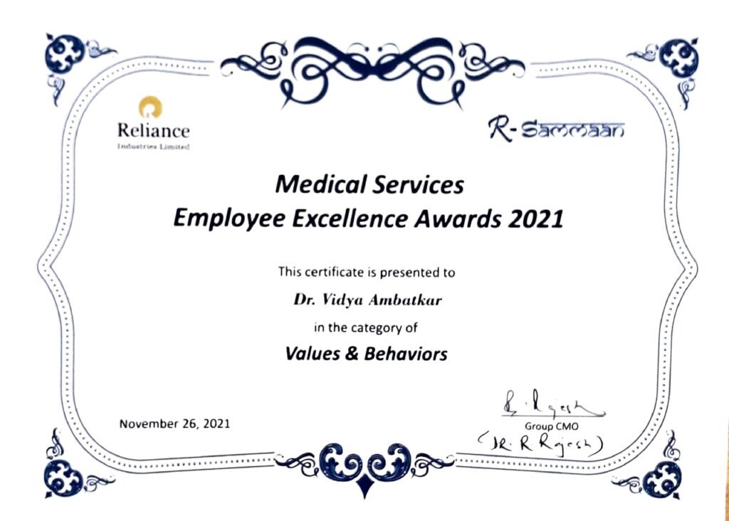 - Awarded Medical Services Employee Excellence Award – 2021 by Reliance